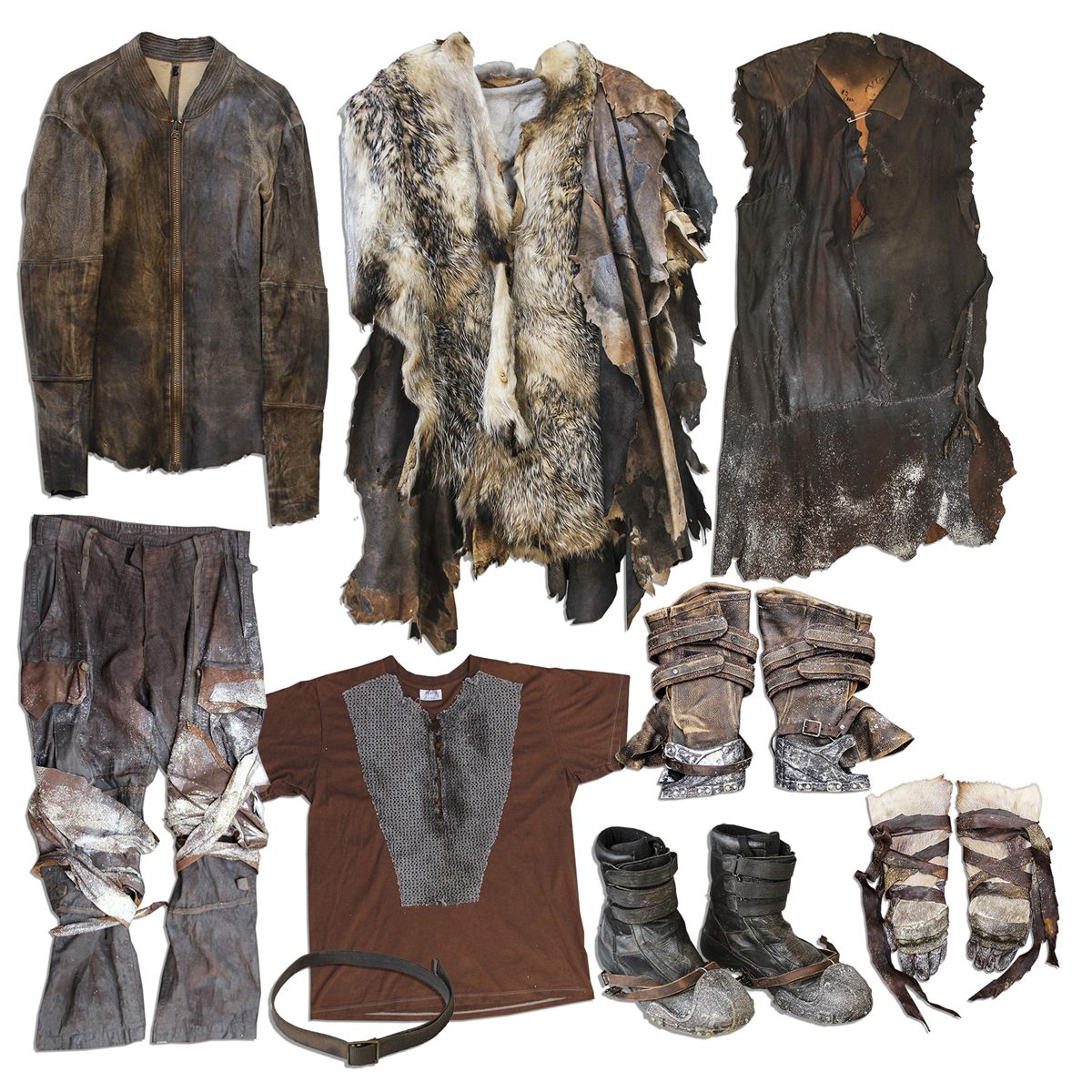 Vin Diesel costume from ''The Chronicles of Riddick''. Diesel stars as Riddick, one of the last of the Furyan kind in the futuristic space-age fantasy universe. Elaborate 8-piece costume appointed heavily with brown leather and fur comprises: (1) brown leather zip-front jacket with black stretchy panels on the sides, (2) brown short-sleeved shirt with netting across the chest, (3) pair of long leather gloves with hair-on hide upper, (4) pair of utility boots, (5) real fur jacket made of various pelts, (6) cargo pants with applied leather decorations, (7) pair of leather shinguards, (8) leather tunic. Pants and tunic have ''Chad 2'' written inside and boots are labeled ''Troy''. Items have an intentional rough-hewn appearance. From the Prop Store.