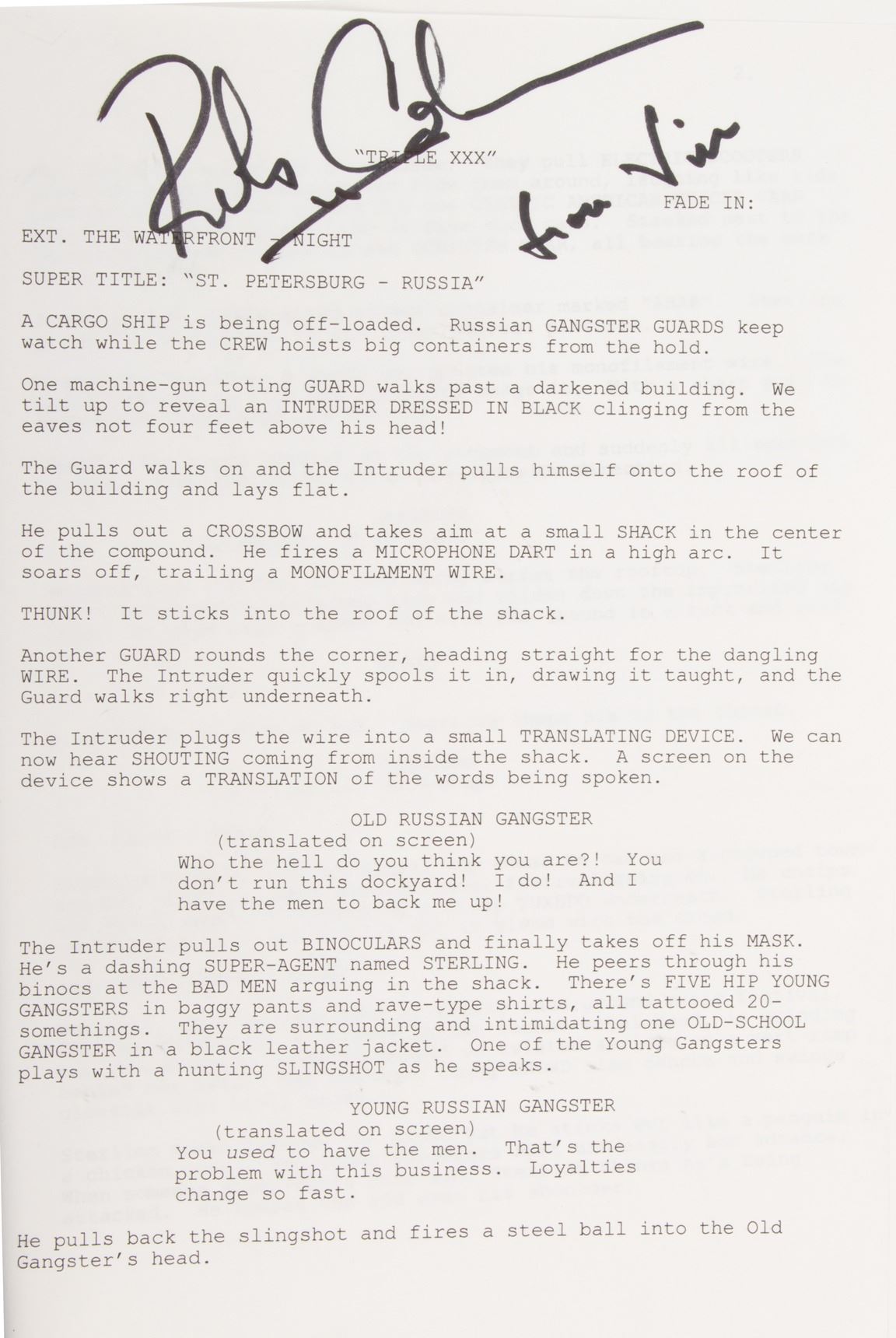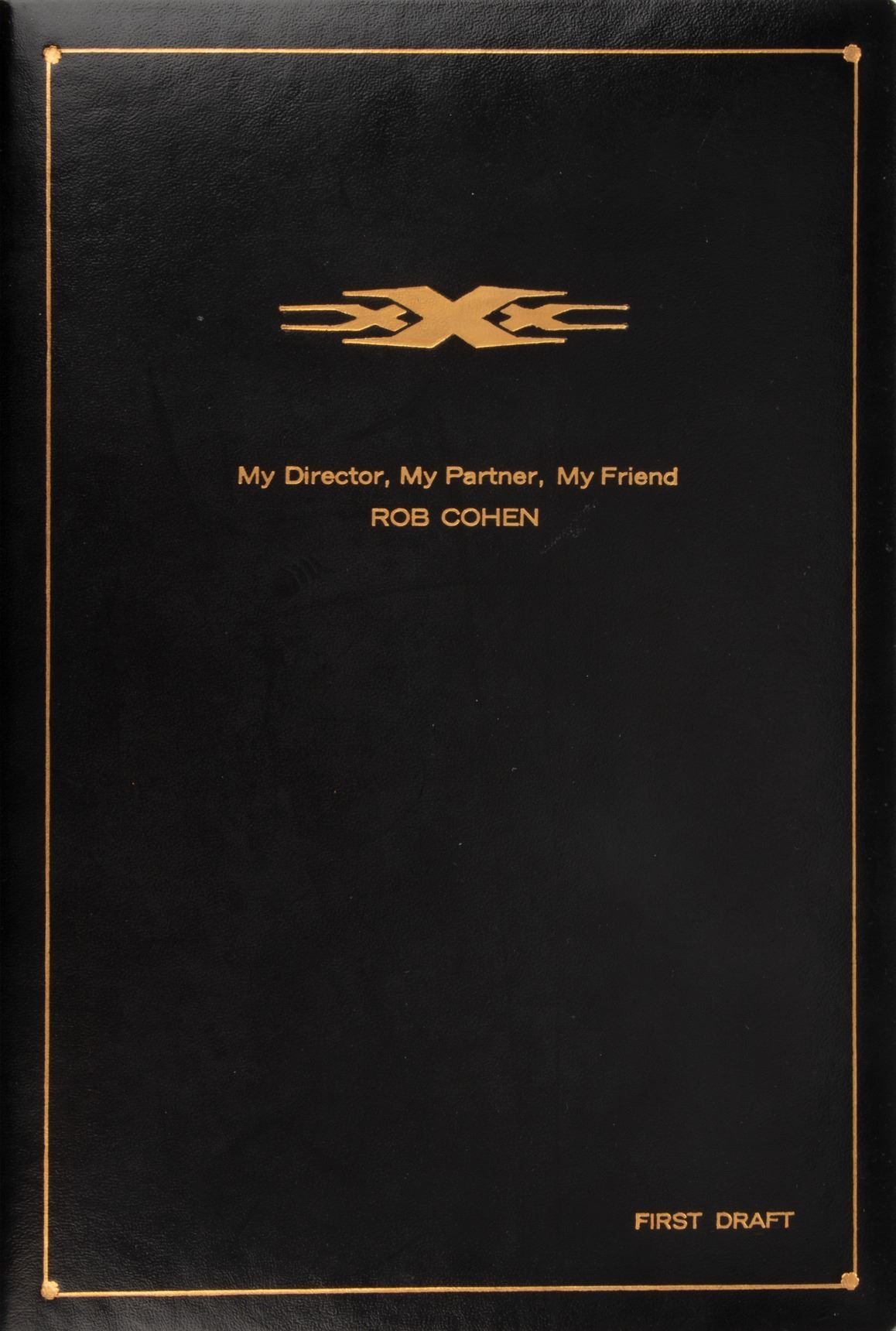 511. Vin Diesel leather book bound First Draft script from XXX presented to director Rob Cohen. (Columbia, 2002) Original black leather book bound 112-page First Draft script, no title page, with gold gilt text on cover, "XXX, My Director, My Partner, My Friend, Rob Cohen, First Draft", with attached leather strip book marker, and first page signed, "Rob Cohen, From Vin". In fine condition. From the collection of Rob Cohen and comes with a signed LOA by him. $400 - $600