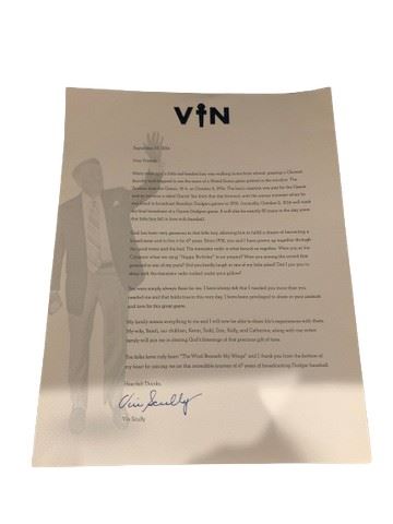 Vin Scully’s retirement letter from September 23, 2016 printed on official stationary paper. Signature is robo-copied.