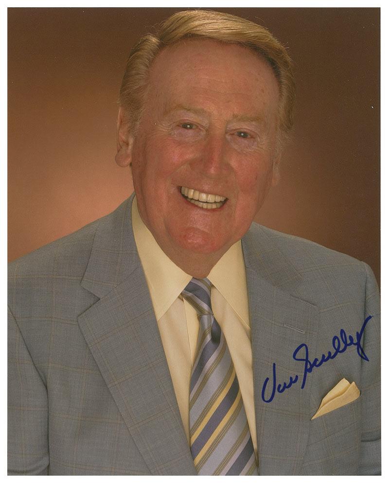 Glowing color 8 x 10 cardstock photo of the legendary broadcaster in a suit and tie, signed in blue felt tip. In very fine condition.