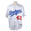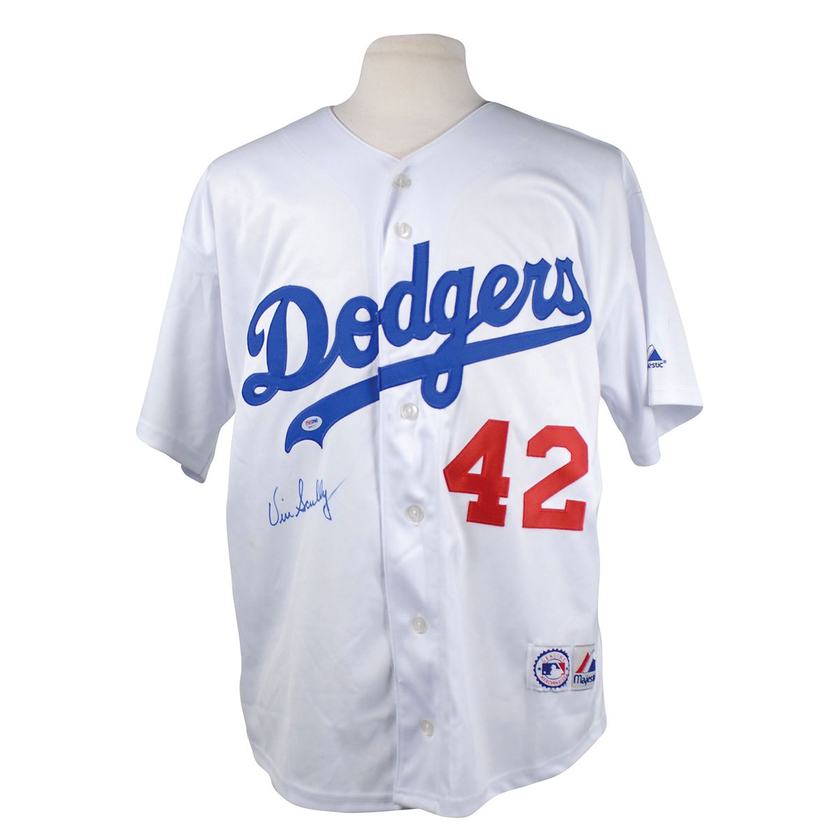 Official Majestic replica Jackie Robinson Brooklyn Dodgers baseball jersey, with sewn on letters and numbers, signed in blue felt tip on the front. In fine condition, with some scattered soiling and a PSA/DNA label affixed to the team logo. Accompanied by a certificate of authenticity from PSA/DNA.