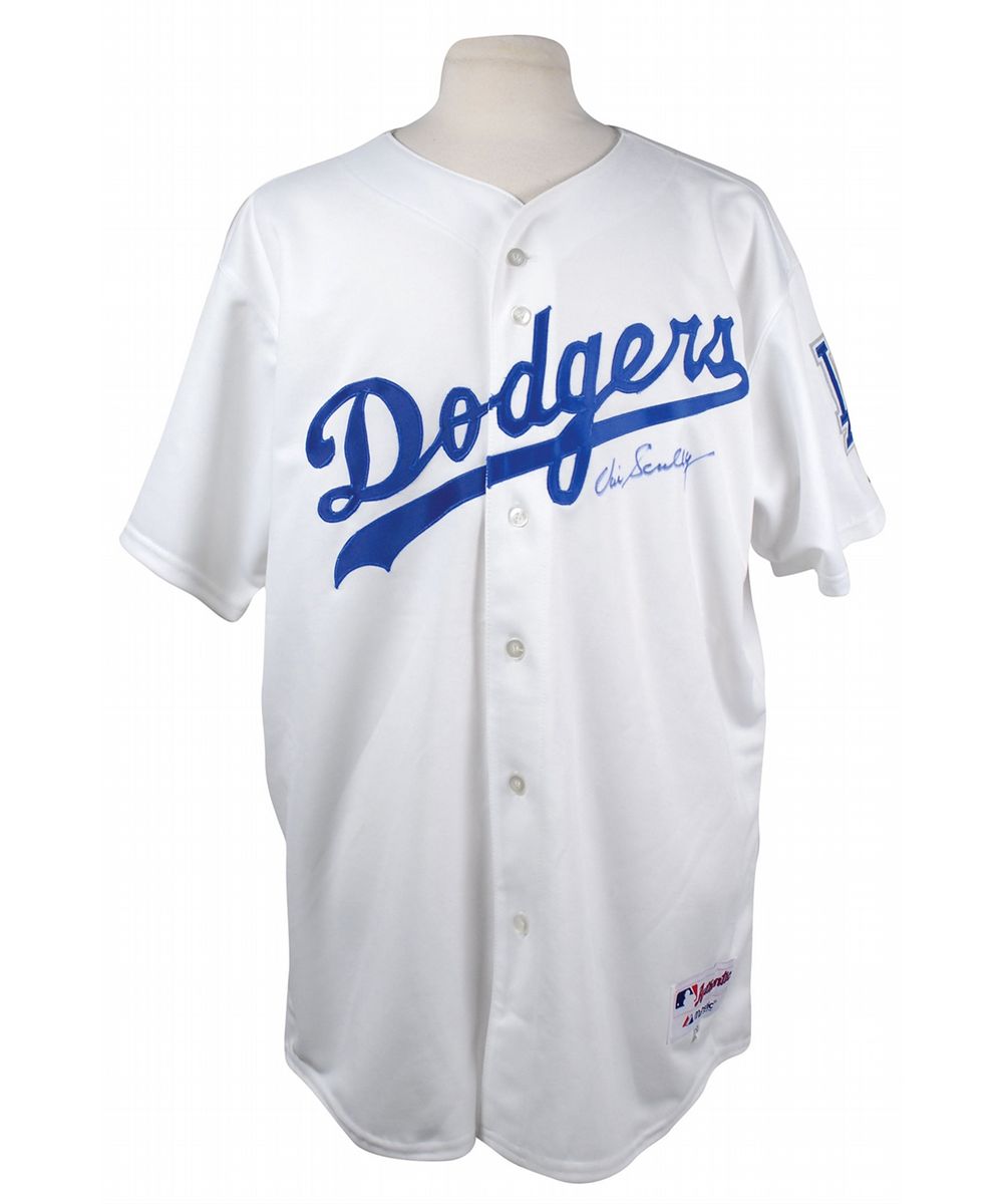 Uncommon official Majestic replica Los Angeles Dodgers baseball jersey, with sewn on letters and numbers, signed in blue felt tip on the front. In fine condition.