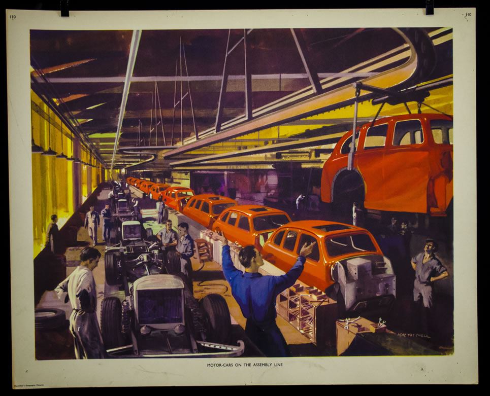 Vinatge MacMillan Educational Posters c.1950s, - #110 - "Motor Cars On The Assembly Line". Aside from the expected Pin holes in the corner, these posters are in great condition with exceptional vibrant color!
