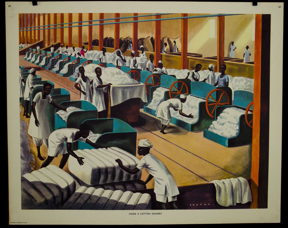 Vinatge MacMillan Educational Posters c.1950s, - #69 - "Inside A Cotton Ginnery". Aside from the expected Pin holes in the corner, these posters are in great condition with exceptional vibrant color!
