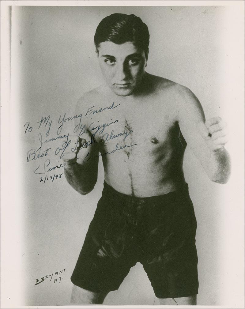 Boxer, older brother of former world champion Joe Dundee, who retired with a record of 118-20-13. Vintage matte-finish 8 x 10 photo, signed and inscribed in fountain pen “To my young friend: Jimmy Wiggins, Best of luck always, Vince Dundee 2/13/48.” In fine condition, with a couple light surface creases and light rippling along bottom edge.