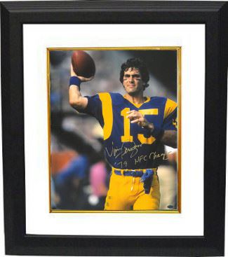 Vince Ferragamo played for the Los Angeles Rams (1977–1980 and 1982–1984), Buffalo Bills (1985) and Green Bay Packers (1985–1986). After leading the 9-7 Rams to road victories over the Dallas Cowboys and Tampa Bay Buccaneers in the 1979 NFL Playoffs, Ferragamo started for the Rams in Super Bowl XIV, making him the first quarterback to start a Super Bowl in the same season as his first career start, in which the Rams led after three quarters of play before falling to the Pittsburgh Steelers 31-19. Vince Ferragamo has hand signed this Los Angeles Rams 16x20 Photo with '79 NFC Champs inscription. Leaf Authentics Hologram and Certificate of Authenticity from Athlon Sports. Custom White Mat and Premium Black Color Framed as shown.