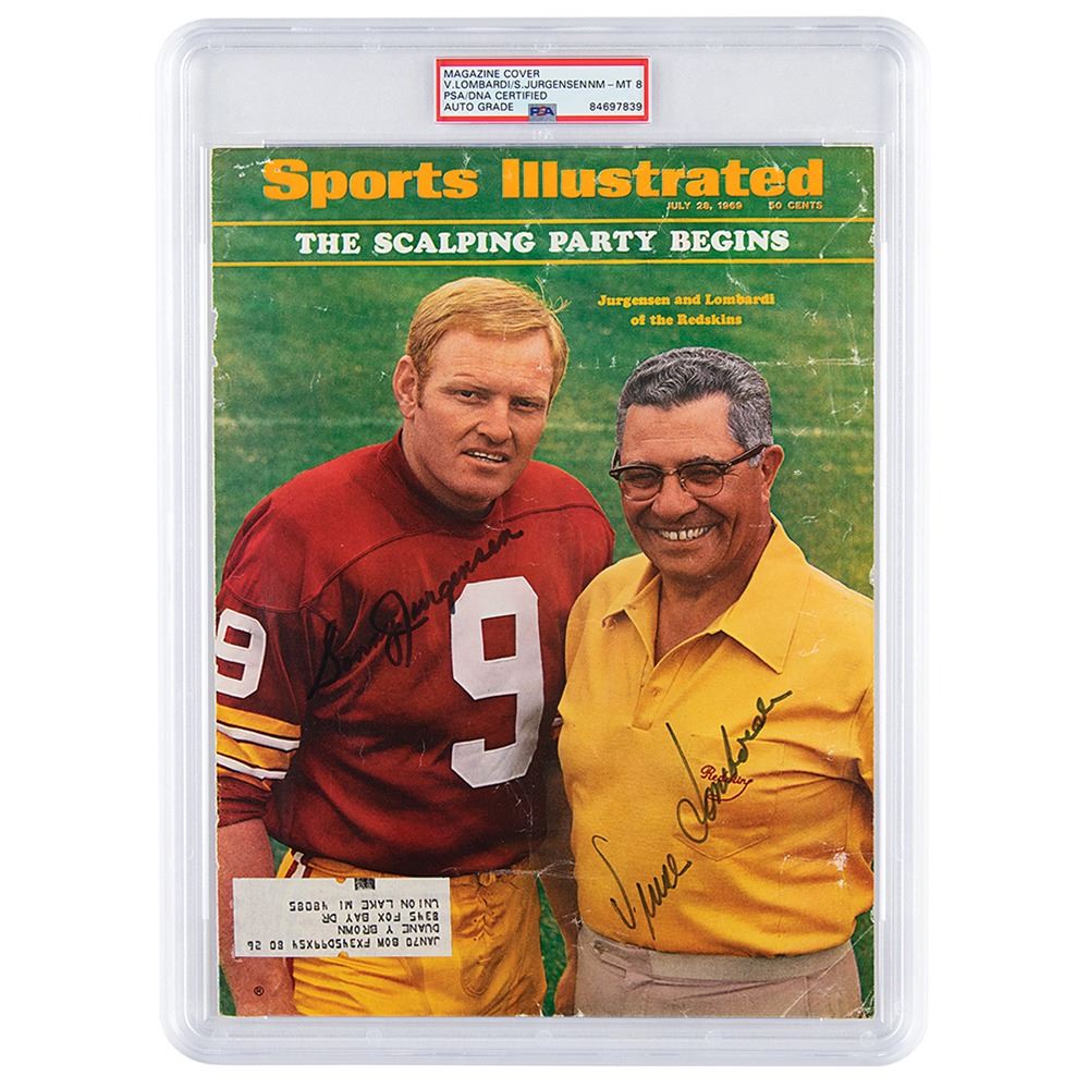 Cover from the Sports Illustrated magazine of July 28, 1969, featuring a story on Lombardi& #39;s new gig with the Washington Redskins, 8.25 x 11, signed in black felt tip, "Vince Lombardi." In fine condition, with light creasing. Encapsulated and graded by PSA/DNA as "NM-MT 8."