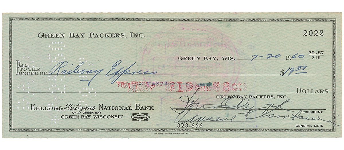 Green Bay Packers, Inc. business check, 8.25 x 3, filled out in another hand and signed by Lombardi, “Vincent Lombardi,” payable to Railway Express for $19.38, July 20, 1960. In fine condition, with expected holes and light show-through from stamps on reverse.