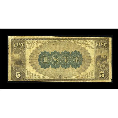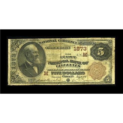<B>Vincennes, IN</B></I> - $5 1882 Brown Back Fr. 472 <B>The First NB</B></I> Ch. # (M)1873<BR>This is the only $5 Brown Back in the census and that fact alone should enable this note to earn a cherished spot in the next collection it enters. <B>Very Good,</B></I> with nice pen signatures. The lower left corner tip is almost detached.<BR><BR><b>Shipping:</b> Coin/Currency (<a target="_blank" href="http://www.heritageauctions.com/common/shipping.php">view shipping information</a>)