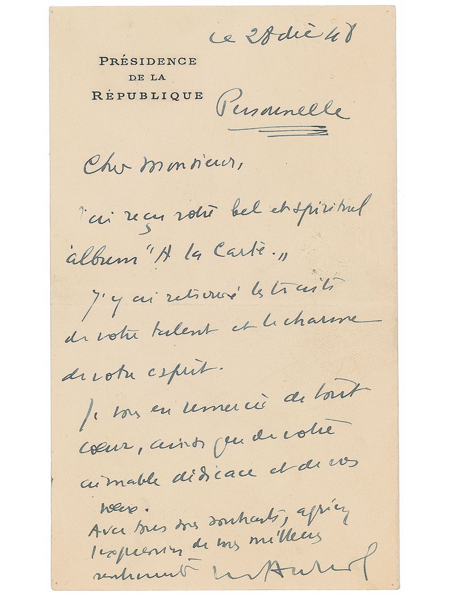 French politician (1884–1966) who served as the first president of the Fourth Republic from 1947 to 1954. Untranslated ALS in French, signed “V. Auriol,” one page, 3.75 x 6.5, presidential letterhead, December 20, 1948. In fine condition.