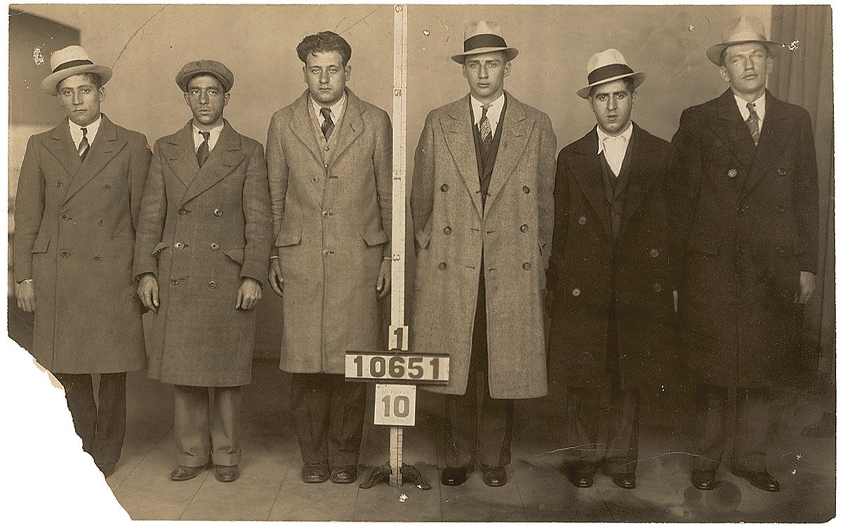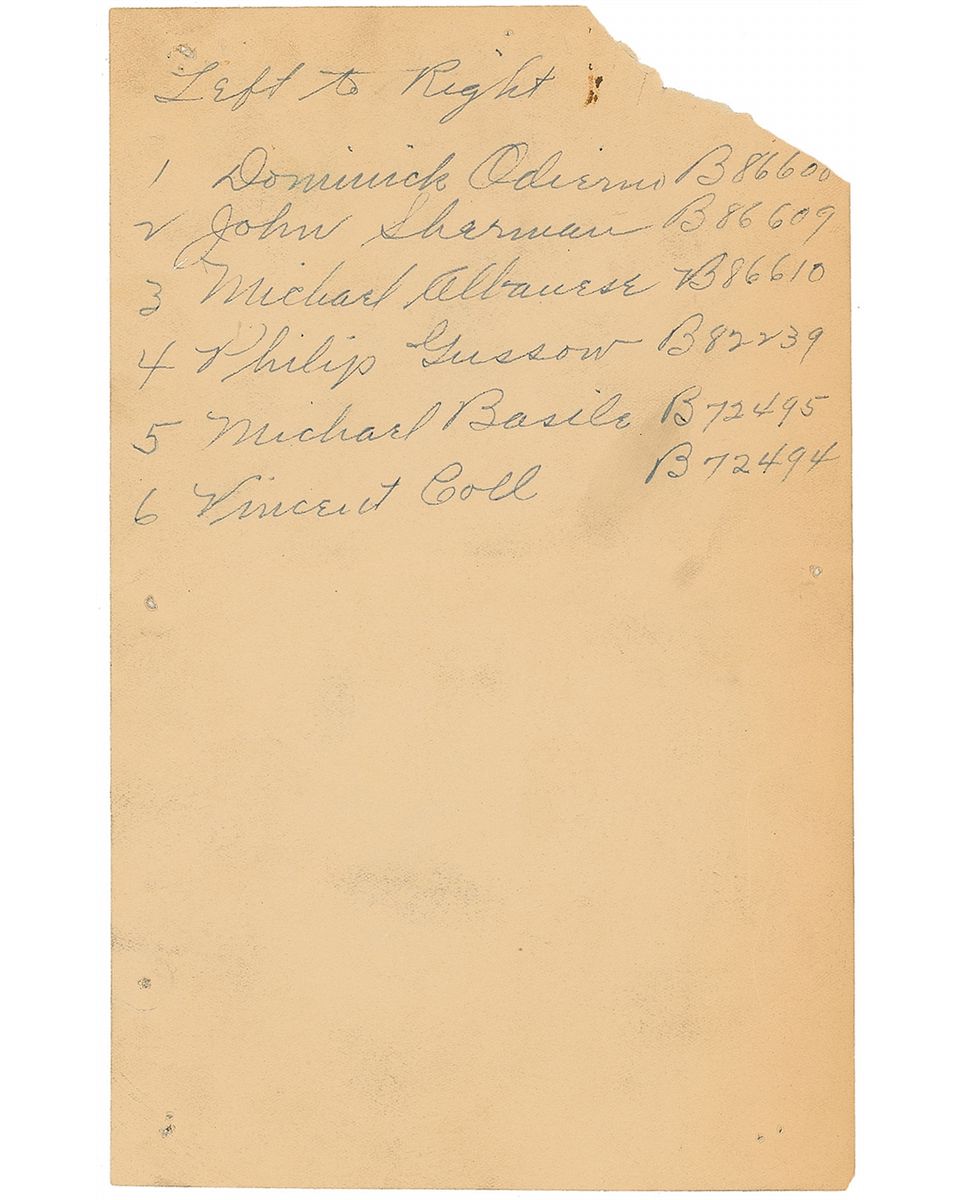 Notorious Irish-American mob hitman (1908–1932) who had been recruited to assassinate Lucky Luciano in a plot foiled by a tip-off. Coll was assassinated by rivals while in a phone booth at age 23. Original glossy 9 x 5.75 police lineup photo displaying six men, identified on the reverse from left to right as “1. Dominick Odierno…2. John Sherman…3. Michael Altavese…4. Philip Gussow…5. Michael Basile…6. Vincent Coll.” In very good condition, with tack holes to the borders (affecting only the background) and paper loss to the lower left corner. Odierno and Basile were associates of Coll and all three were charged in connection with the shooting death of Michael Vengalli, a five-year-old child. Coll earned his nickname in the aftermath, when New York City Mayor Jimmy Walker dubbed him ‘Mad Dog.’ Provenance: Eugene Canevari Collection.
