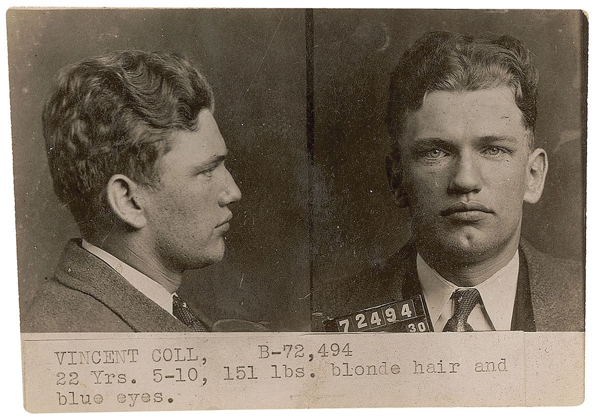 Notorious Irish-American mob hitman (1908–1932) who had been recruited to assassinate Lucky Luciano in a plot foiled by a tip-off. Coll was assassinated by rivals while in a phone booth at age 23. Original glossy 4.5 x 3.25 mug shot photo of Coll, bearing an inherent caption to the lower border with a physical description. In fine condition. Provenance: Eugene Canevari Collection.