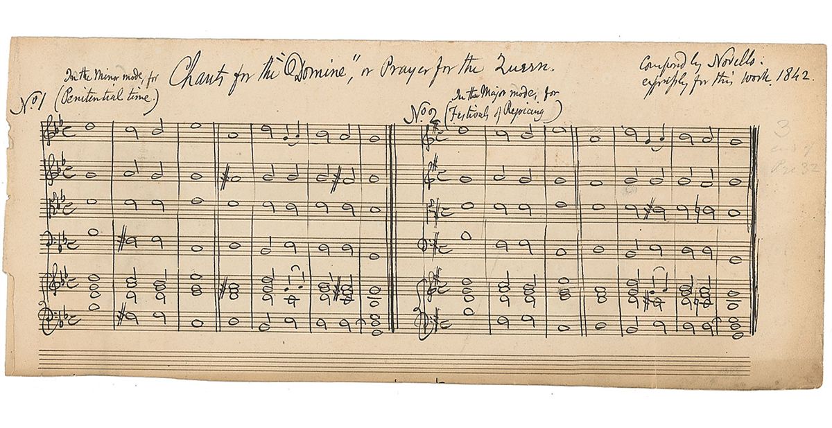 English musician (1781–1861) who was a composer of popular sacred music. Excellent AMQS on an off-white 11.25 x 4.5 sheet. Titled at the top by Novello, “Chants for the ‘Domine’ or Prayer for the Queen,” Novello pens two works titled “No. 1 Penitential Ti