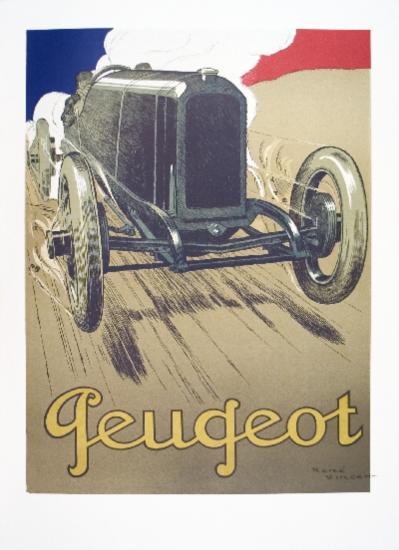 Notes: Lithographic reproduction of an vintage advertising for Peugeot. Printed and published by ARTE in Paris. Original image was created by Rene Vincent. The lithograph measures 37 x 26 1/2 inches.
