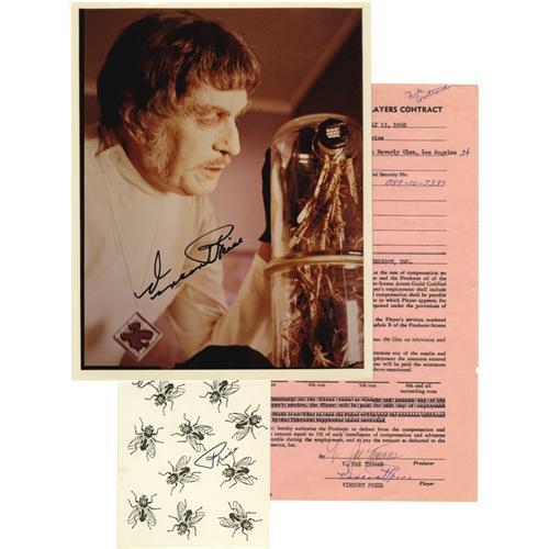 <B>Vincent Price Autograph, Signed Photo, and Signed Contract.</B></I> This creepy lot includes a signed postcard (Price surreptitiously hid his signature among the flies on the card), a signed color still from <I>The Abominable Dr. Phibes,</B></I> and a signed agreement from 1960 to appear in a production entitled <I>Weavers of Death.</B></I> All are in Very Fine condition with slight yellowing to photo.<BR><BR><b>Shipping:</b> Flat Material, Small (<a target="_blank" href="http://www.heritageauctions.com/common/shipping.php">view shipping information</a>)