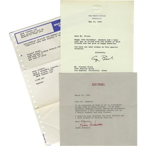 <B>Vincent Price Birthday Lot .</B></I> Here are three items from Vincent Price's 79th birthday in 1990. There is a Western Union mailgram dated May 7, 1990 from Gene Tierney, Price's co-star in <I>Hudson's Bay</B></I> (1941), <I>Laura</B></I> (1944), <I>Leave Her to Heaven</B></I> (1945) and <I>Dragonwyck</B></I> (1946); a note from actor Roddy McDowall to <I>Starlog</B></I> editor Tony Timpone, stating his hope to be in attendance at a May 12 ceremony honoring Price if his work schedule allowed ("...as I deeply respect and love Vincent"); and a May 10, 1990 letter from the White House, wishing Price a Happy Birthday and signed by George Bush. Price died October 25, 1993. The star, Boris Karloff's heir to the cinema horror throne and a much interested (and interesting man), was a truly beloved figure, as these unique items attest. <I>With COA from PSA/DNA.</B></I>