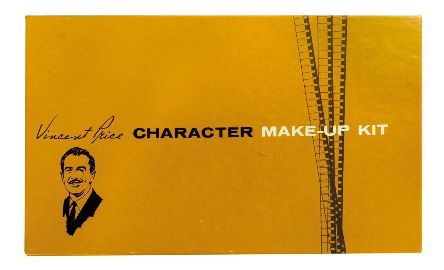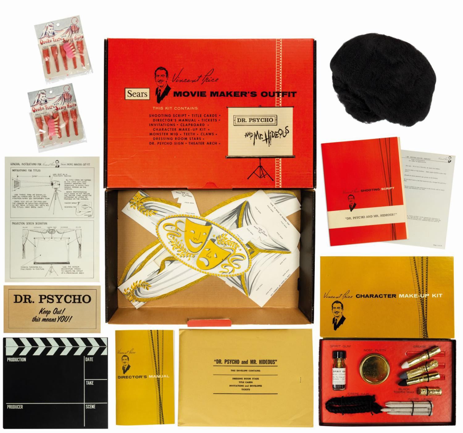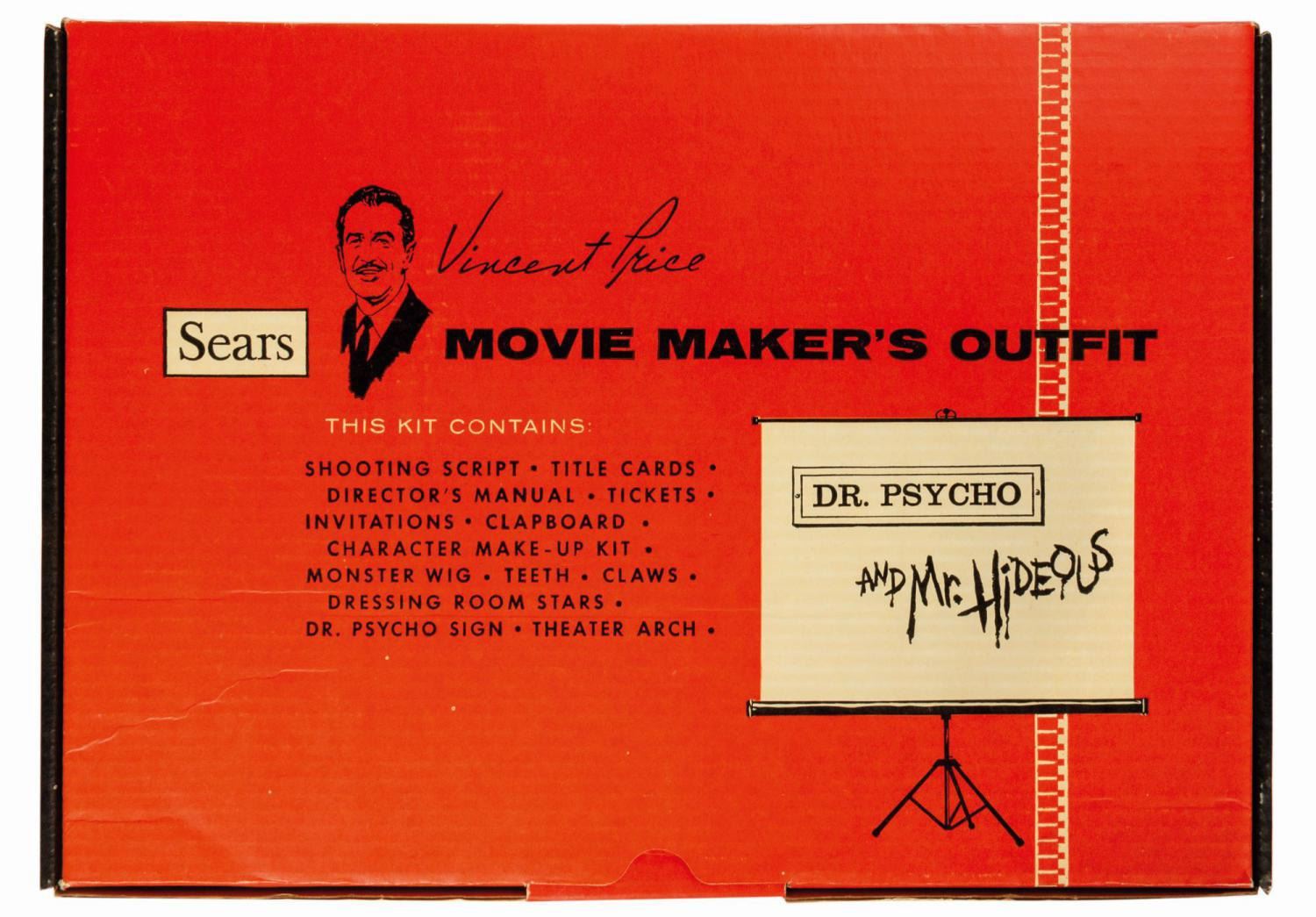 (Sears, 1964) A very rare complete Vincent Price Movie Maker's Outfit for the "Dr. Psycho and Mr. Hideous" story. These kits were offered by Sears to use with their 8mm film cameras. The kit contains the props, makeup, a script, and director's instructions for producing the short horror film at home with your friends and family. This particular kit is complete and unused, containing the script, prop hair, teeth, fingernails, clapperboard, makeup and nose putty, title cards, and much more. A very intricate and hard to find collectible, the kit measures 13.25"x19.25" and 2.75" tall. The condition is very fine with minor edge wear to the box.