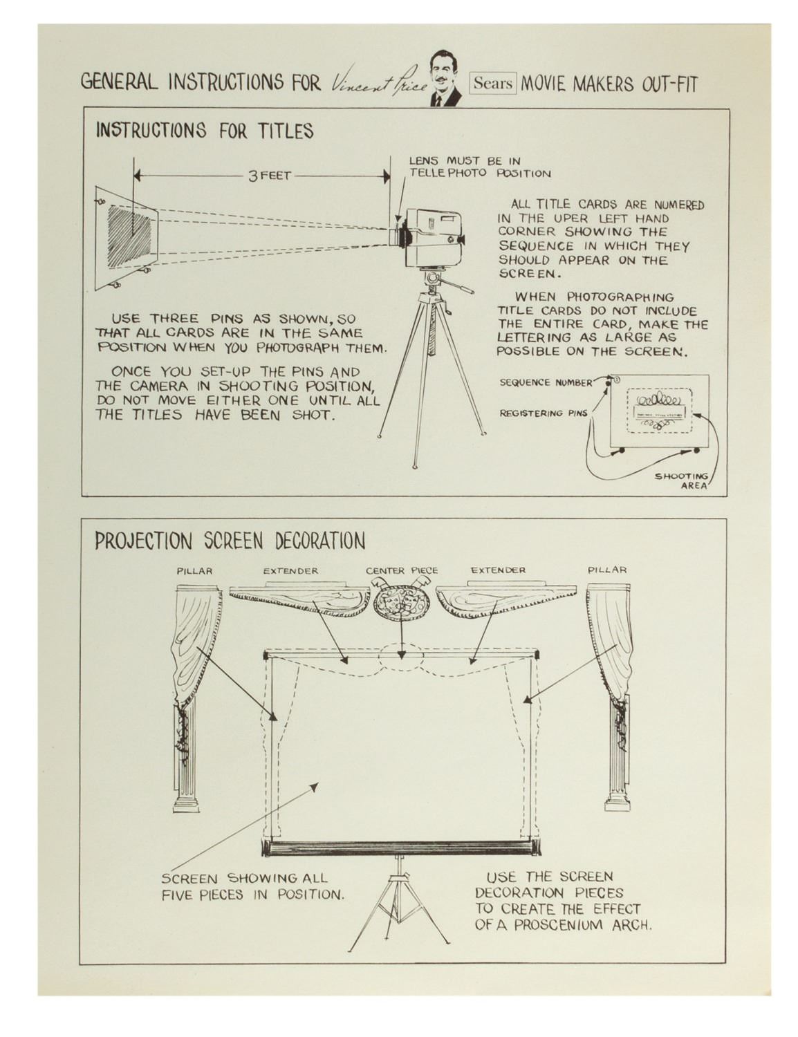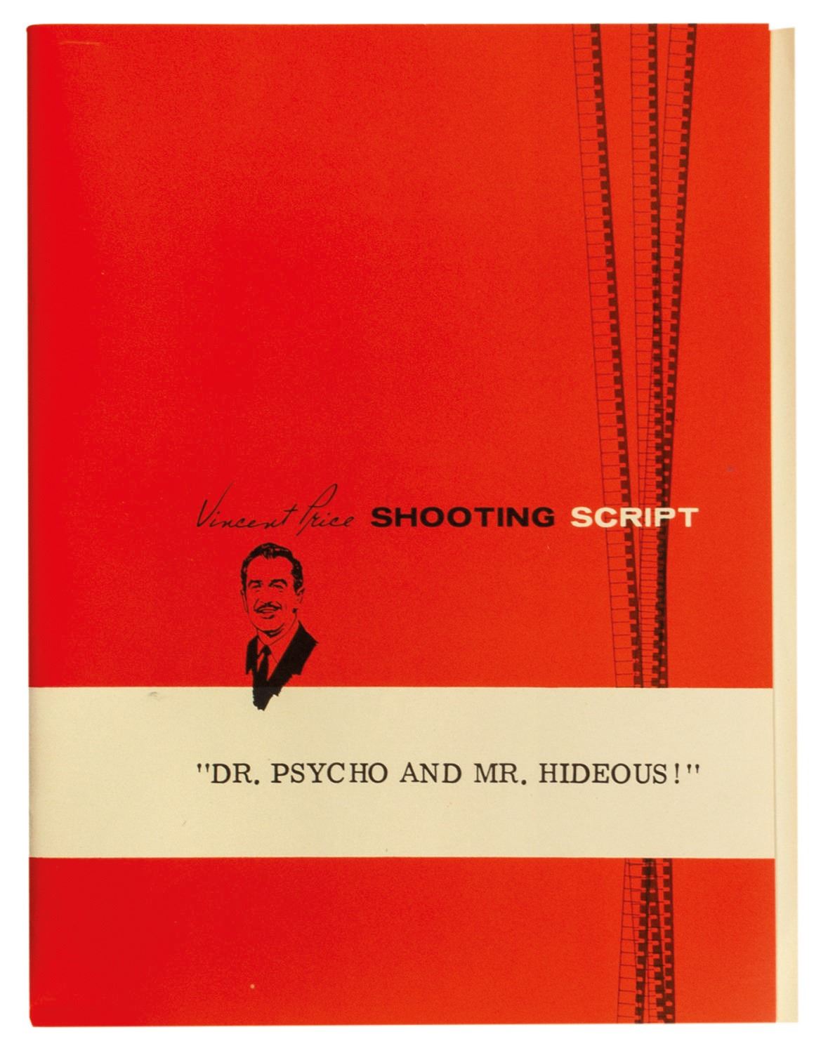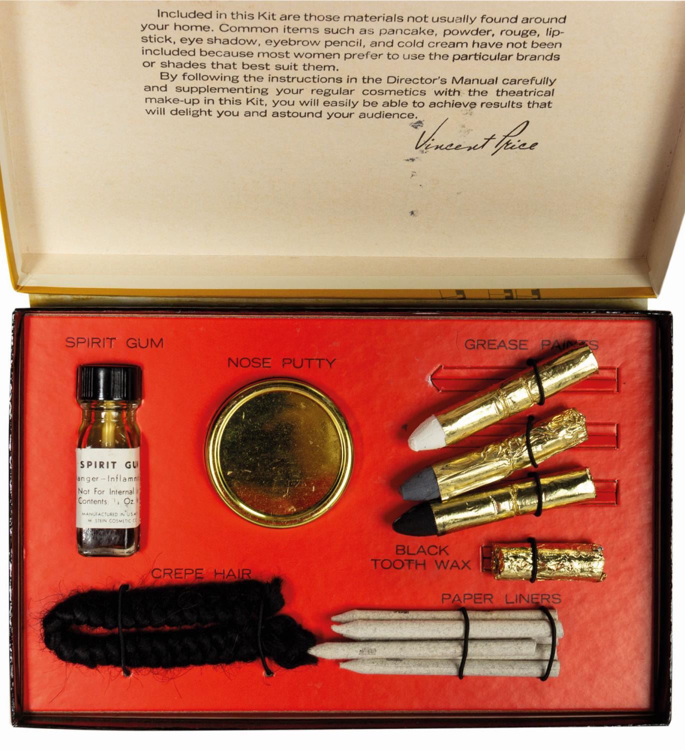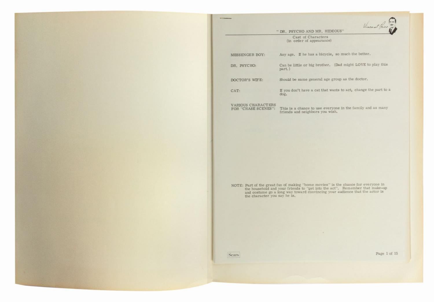 (Sears, 1964) A very rare complete Vincent Price Movie Maker's Outfit for the "Dr. Psycho and Mr. Hideous" story. These kits were offered by Sears to use with their 8mm film cameras. The kit contains the props, makeup, a script, and director's instructions for producing the short horror film at home with your friends and family. This particular kit is complete and unused, containing the script, prop hair, teeth, fingernails, clapperboard, makeup and nose putty, title cards, and much more. A very intricate and hard to find collectible, the kit measures 13.25"x19.25" and 2.75" tall. The condition is very fine with minor edge wear to the box.