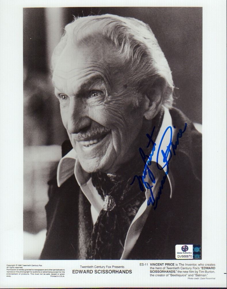 Black and white original 8x10 press photo from the film Edward Scissorhands signed by Vincent Price. The signature has been certified by Global Authentics and issued number GV866870. All items come with a certificate of authenticity good for the life of the piece.