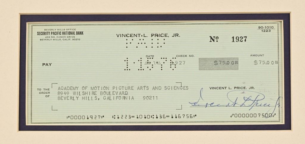 Security Pacific National Bank, pay to the order of Academy of Motion Picture Arts and Sciences, in the amount of $75. Dated 1-15-1976. Framed 19.25" x 30.25"