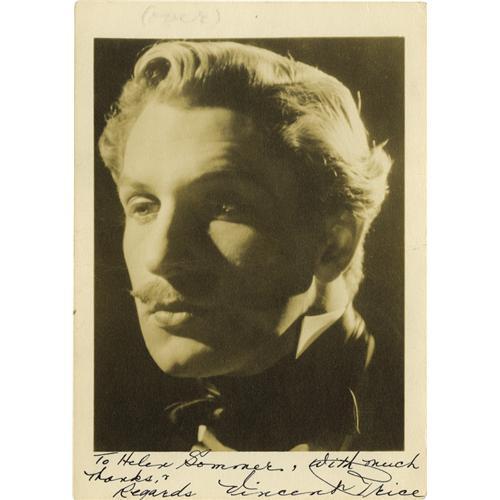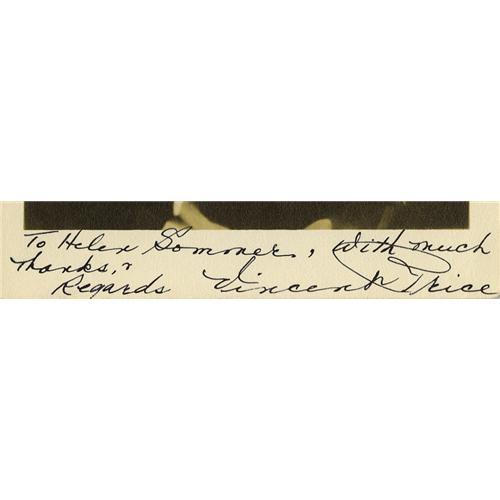 <B>Vincent Price Signed Photo.</B></I> This nice 5" x 7" b&w photo of the actor as a young man during his early stage career is inscribed "To Helen Sommer, with much thanks, Regards Vincent Price" in black ink on the front, and a handwritten message on the back that reads: "Dear Helen Sommer, I can never tell you how proud I am that you should want this. It was taken in London in 1935, and I think it's the best of Albert. Again thanks ever, Vincent Price, 1939, 'Outward Bound'." In great condition with light overall discoloration and some mild creasing across the center. <I>With COA from PSA/DNA.</B></I>