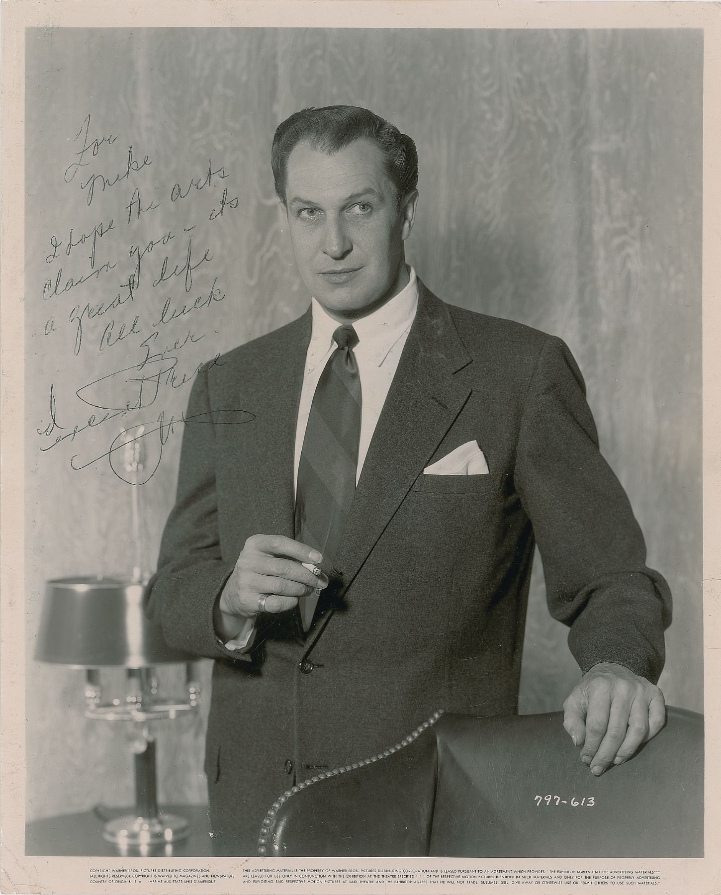 Vintage glossy 8 x 10 Warner Bros. publicity photo of Price smoking a cigarette, signed and inscribed in black ballpoint, "For Mike, I hope the arts claim you—it's a great life. All luck, ever, Vincent Price.” In very good to fine condition, with scattered light creasing and pinpoint surface impressions.