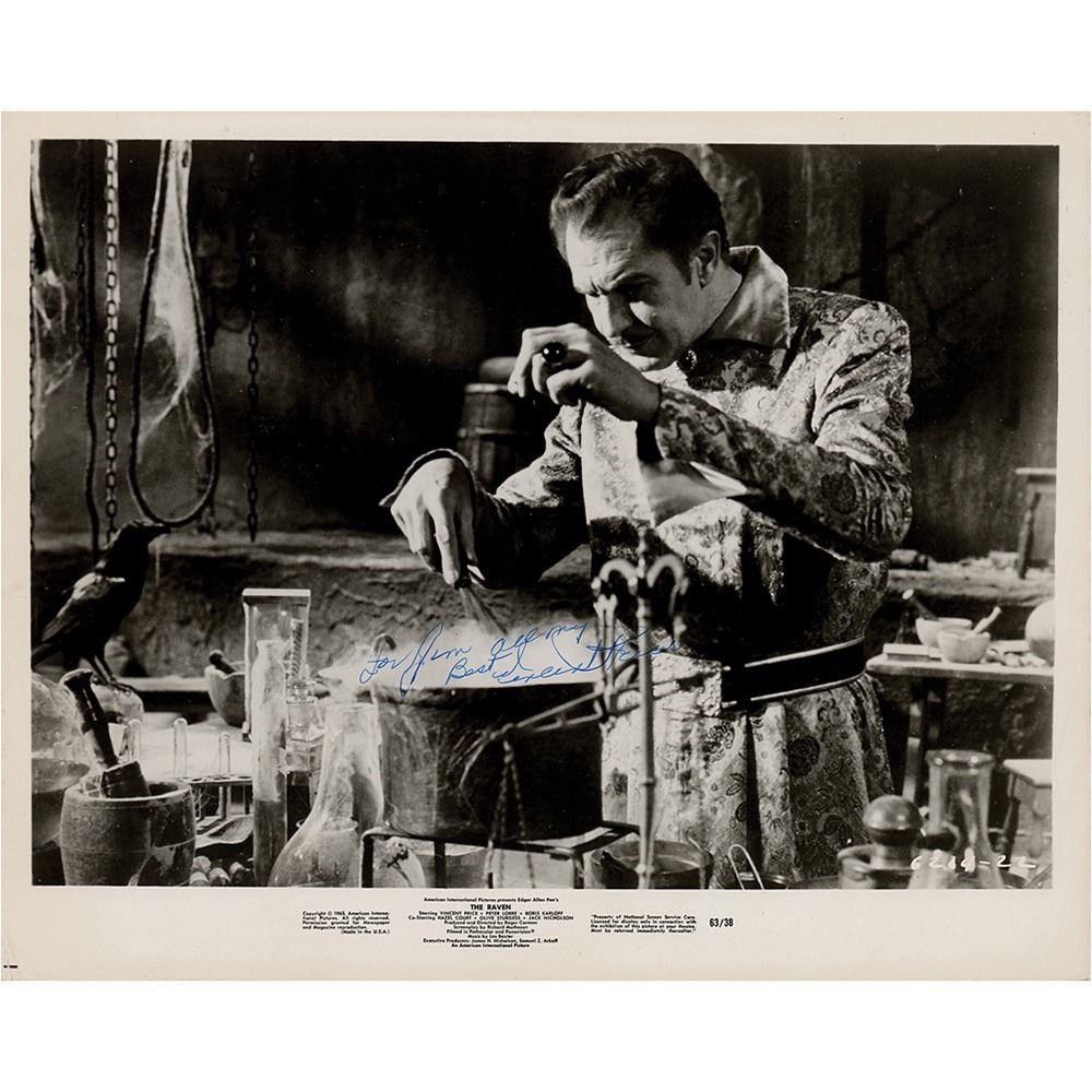 Glossy 10.25 x 8 American International publicity photo of Price as Dr. Erasmus Craven in the 1963 gothic horror film The Raven, signed and inscribed in blue ink, "For Jim, all my best, Vincent Price." In fine condition, with scattered small creases.