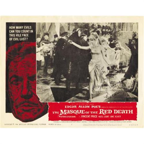 <B>Vincent Price Signed "Masque of the Red Death" Lobby Card.</B></I> A 14" x 11" lobby card for Roger Corman's chilling 1964 adaptation of the Edgar Allen Poe story, inscribed and signed by Price in black felt tip. The lobby card is numbered 64/229, and is in Fine to Very Fine condition with mild to moderate tanning and some creases and wear along the edges. <I>Accompanied by LOA from PSA/DNA.</B></I><BR><BR><b>Shipping:</b> Flat Material, Small (<a target="_blank" href="http://www.heritageauctions.com/common/shipping.php">view shipping information</a>)