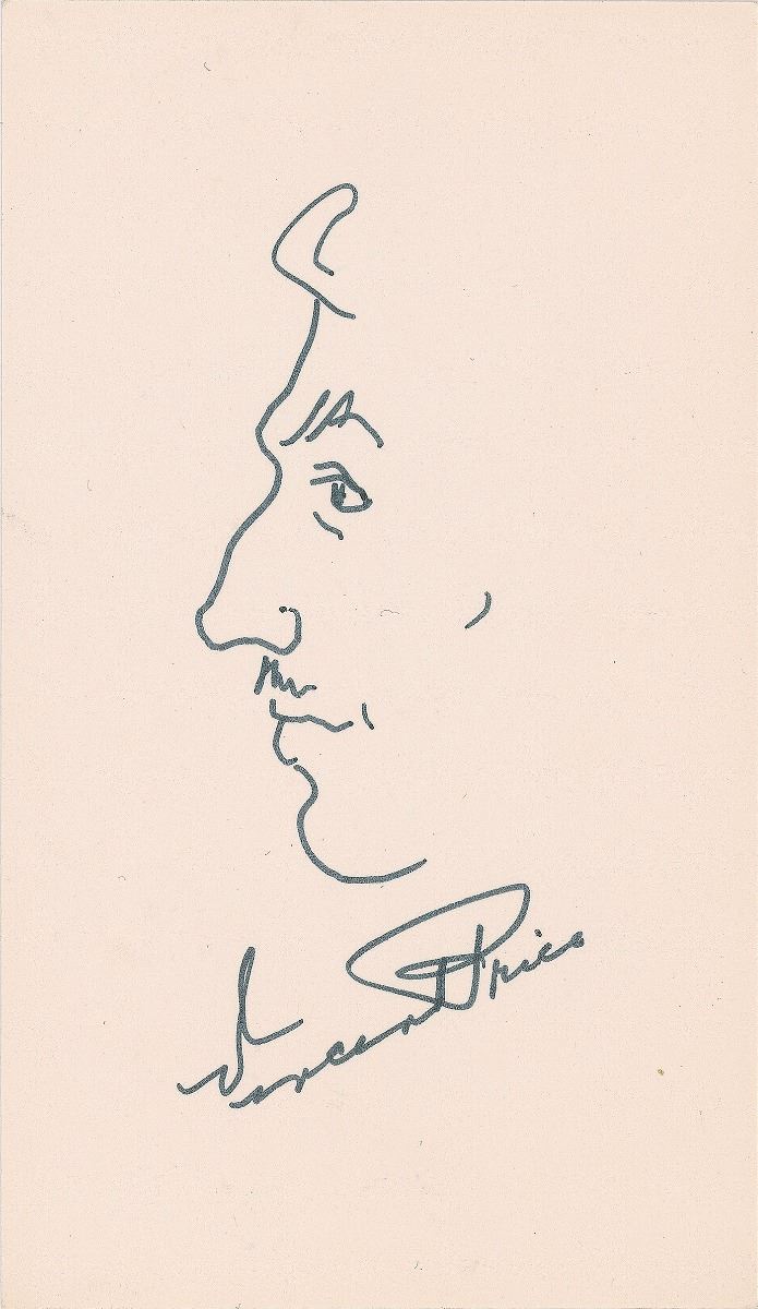 Excellent black felt tip self-portrait profile sketch on an off-white 3.75 x 6.5 card, signed at the bottom, “Vincent Price.” In fine condition.