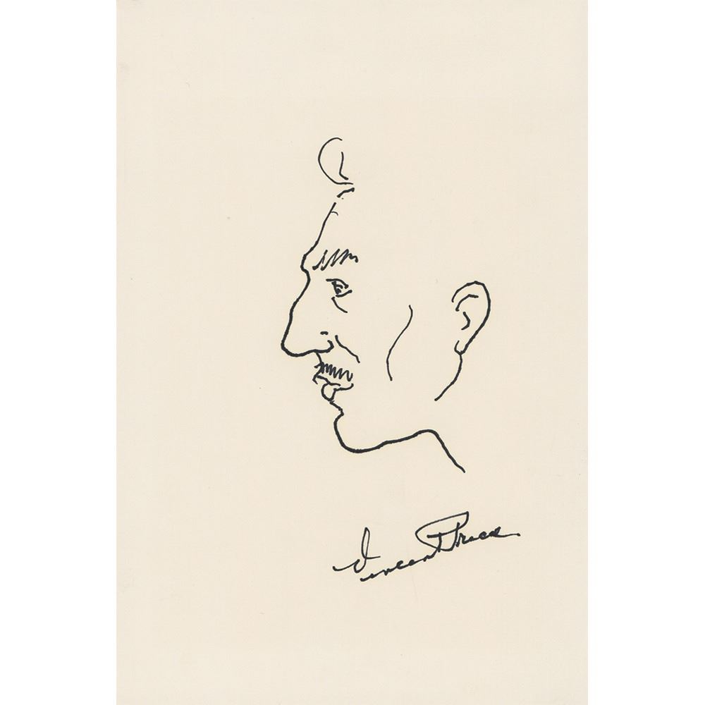 Original felt tip self-portrait sketch accomplished by Price on an off-white 6 x 9 sheet, signed below in black felt tip, "Vincent Price." In very fine condition. Accompanied by two vintage unsigned 5 x 7 portraits.