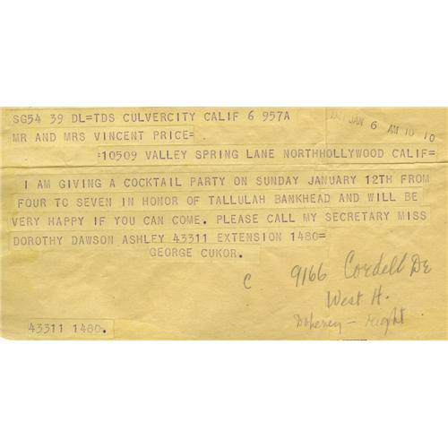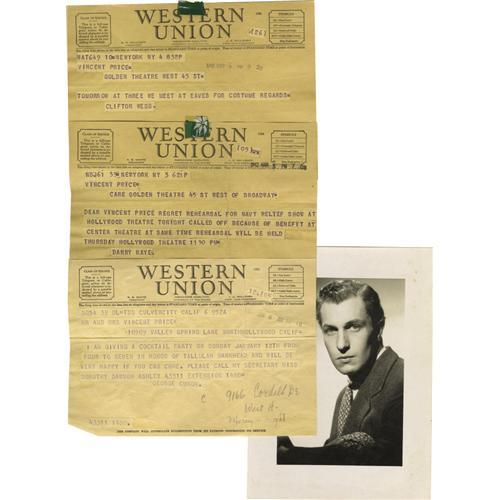 <B>Vincent Price Telegrams and Photo.</B></I> As most last-minute correspondences and invitations were sent via telegram in the '40s, Vincent Price received, and saved, many from his famous friends. Included in this lot are telegrams from Clifton Webb, Danny Kaye, and George Cukor (inviting Price to a party honoring Tallulah Bankhead). Also included is a 6" x 8" headshot of a young Price by noted UK theater photographer Houston Rogers, with his studio stamp en verso. In Very Fine condition with typical yellowing to telegrams due to age and crease marks due to storage.<BR><BR><b>Shipping:</b> Flat Material, Small (<a target="_blank" href="http://www.heritageauctions.com/common/shipping.php">view shipping information</a>)