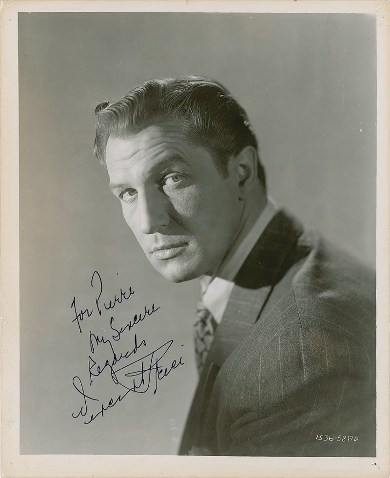 Striking vintage glossy 8 x 10 photo of a young Price, signed and inscribed in-person in black fountain pen “For Pierre, My Sincere Regards, Vincent Price.” Some light creasing and emulsion loss to edges, a single tack hole to each corner, and some scattered small surface impressions, including a few to facial area only visible at an angle, otherwise fine condition.
