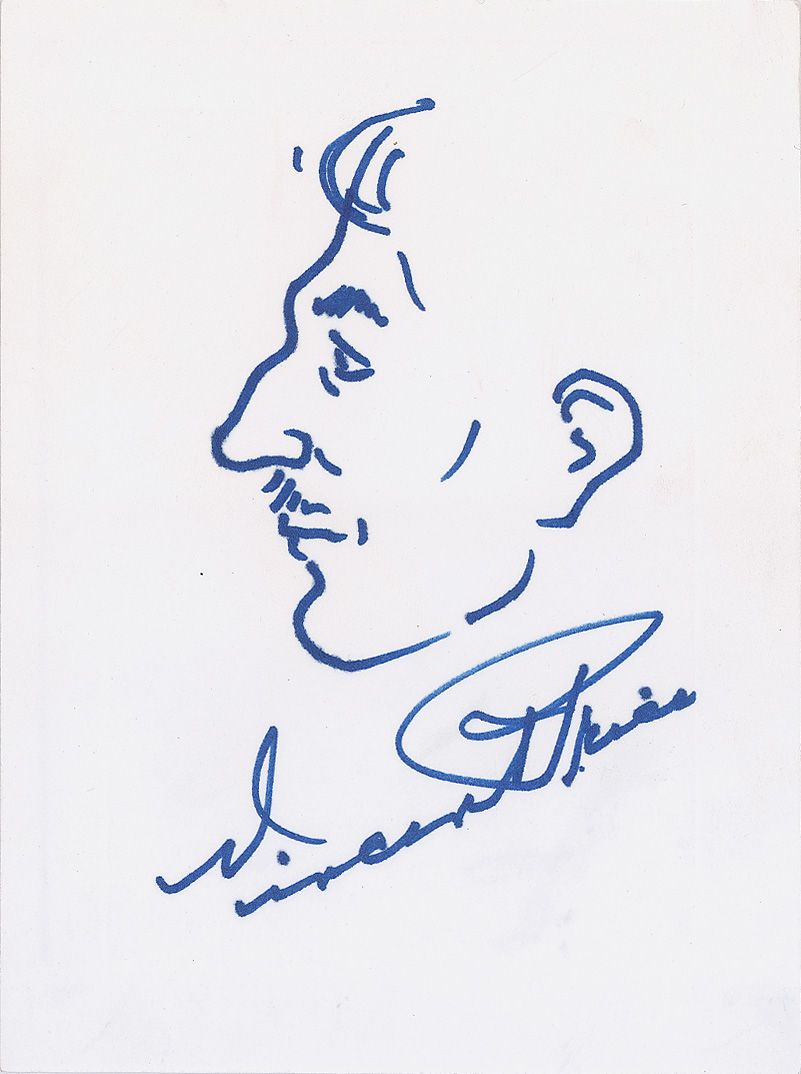 Original and very detailed signed felt tip self-portrait profile on an off-white 4.5 x 6.25 card. In very fine condition.