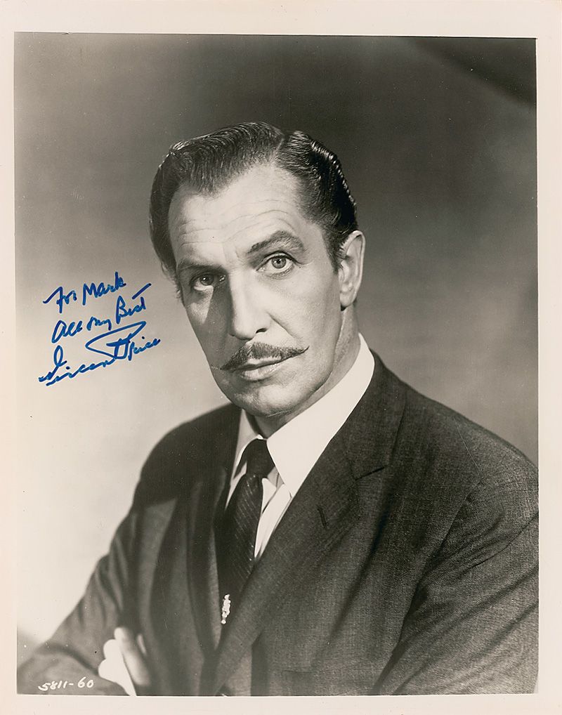 Glossy 8 x 10 photo, signed and inscribed in blue felt tip “For Mark, All my best, Vincent Price.” In very good condition, with mild overall horizontal rippling.