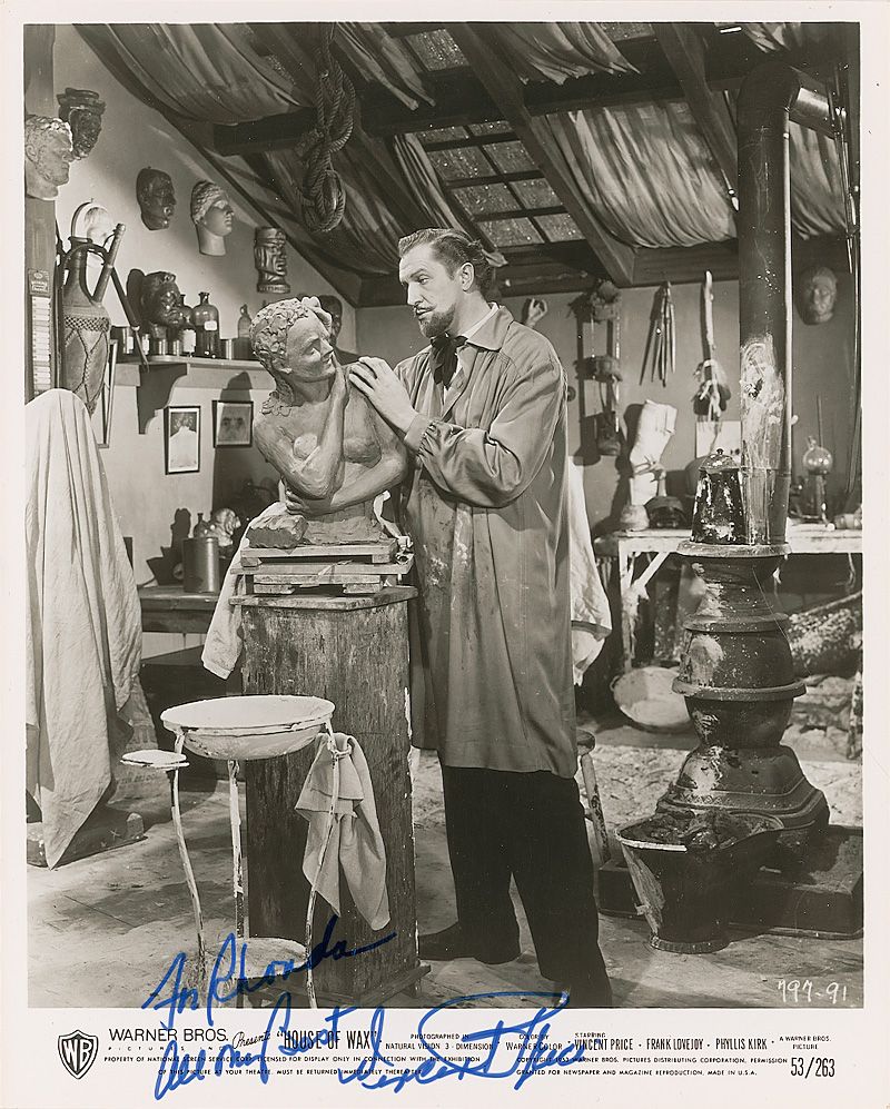 Glossy 8 x 10 Warner Brothers promotional photo for House of Wax, signed and inscribed in blue felt tip “For Rhonda, All my best, Vincent Price.” In fine condition.