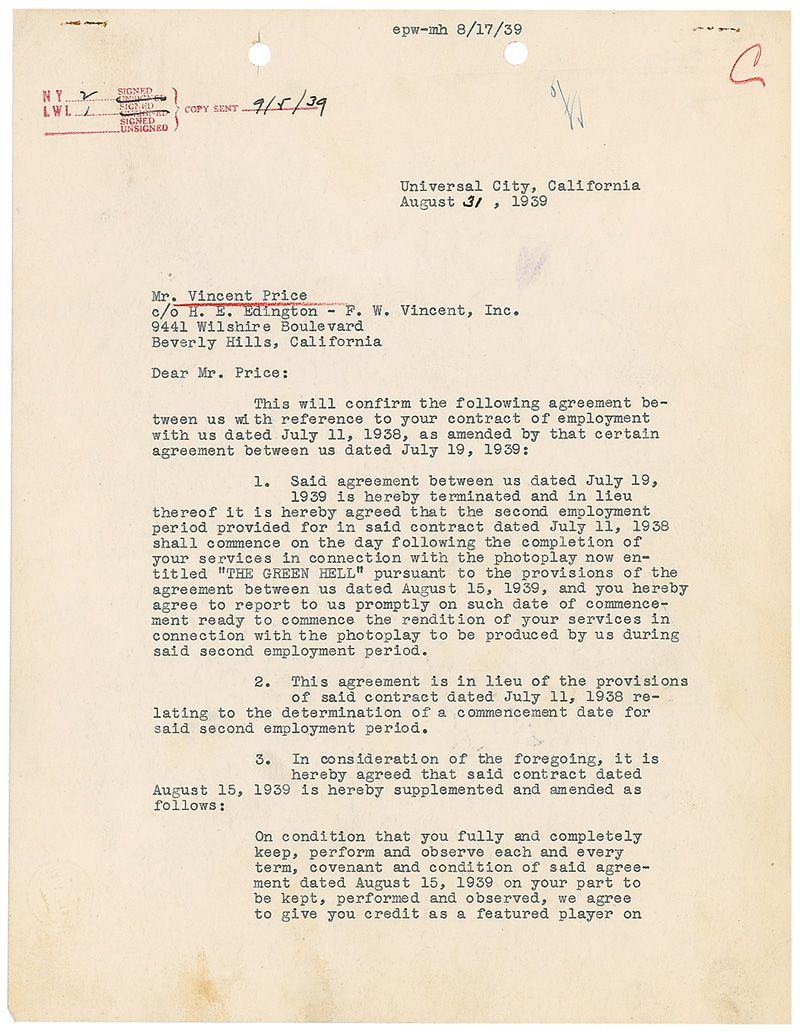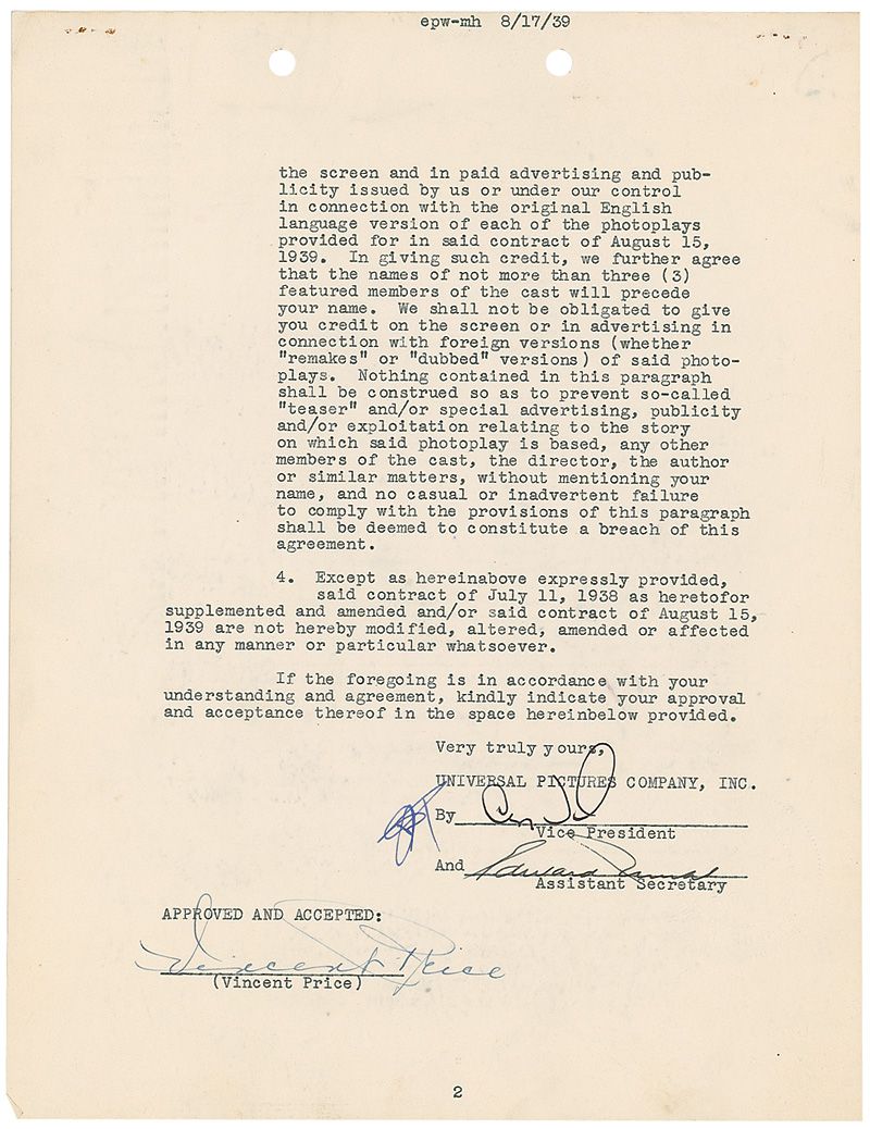 DS, two pages, 8.5 x 11, August 31, 1939. Agreement with Universal after filming The Green Hell. In part: “We agree to give you credit as a featured player on the screen and in paid advertising and publicity issued by us or under our control in connection with the original English language version of each of the photoplays…In giving such credit, we further agree that the names of no more than three (3) featured members of the cast will precede your name.” Signed at the conclusion by Price. Some irregular toning to the first page, ink and pencil office notations to the top of the first page, rusty staple marks to the top, and expected filing holes to the top, otherwise fine condition.