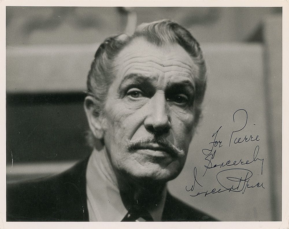 Glossy 10 x 8 photo, signed and inscribed in-person in fountain pen “For Pierre, Sincerely, Vincent Price.” Scattered creases with some cracking to the emulsion, and some surface spotting, otherwise fine condition.
