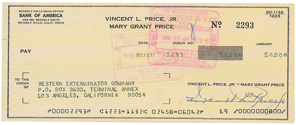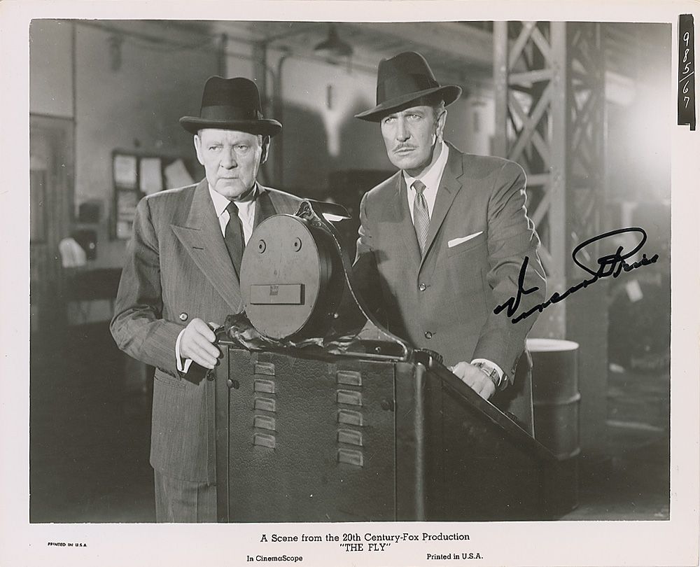 Two items: one 10 x 8 20th Century Fox promotional photo for The Fly, signed in black felt tip, and a personal check, 8.5 x 3.5, filled out in type and signed by Price, “Vincent L. Price, Jr.,” payable to the Western Exterminator Company for $8.00, December 13, 1977. In overall fine condition, with expected cancellation holes and stamps, and a few small creases and tears to the check, and trivial spotting to the finish of the photo.
