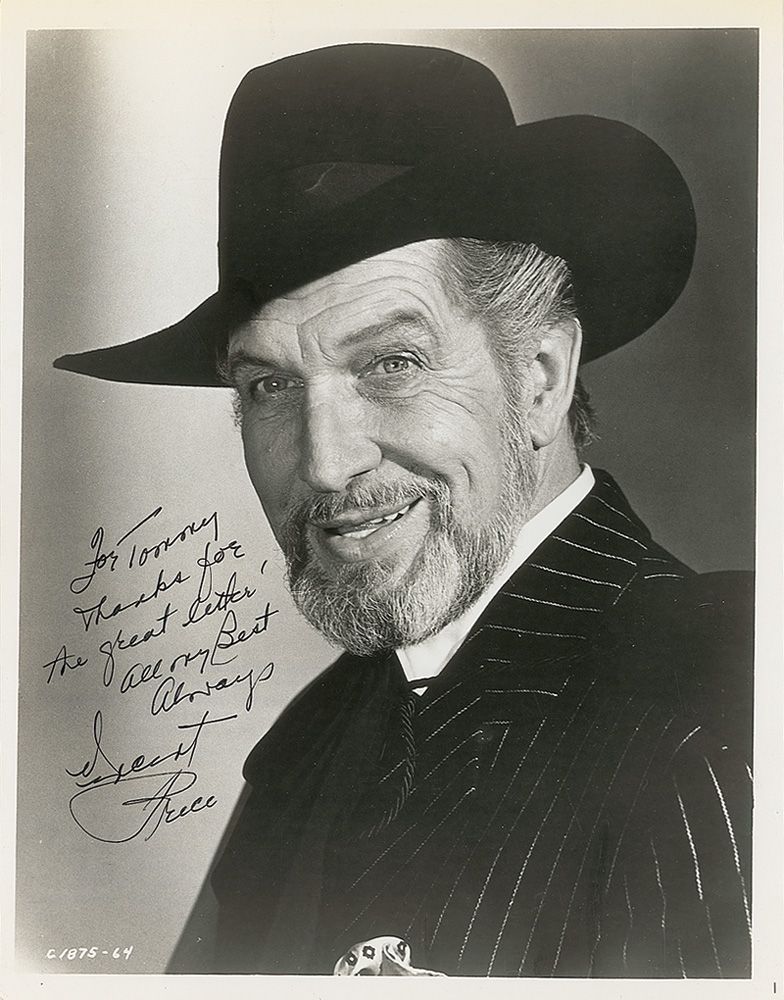 Glossy 8 x 10 photo of Price in a pinstripe suit and black hat, signed and inscribed in black felt tip “For Tommy, Thanks for the great letter! All my best always, Vincent Price.” In fine condition, with a few scattered light surface marks and creases.