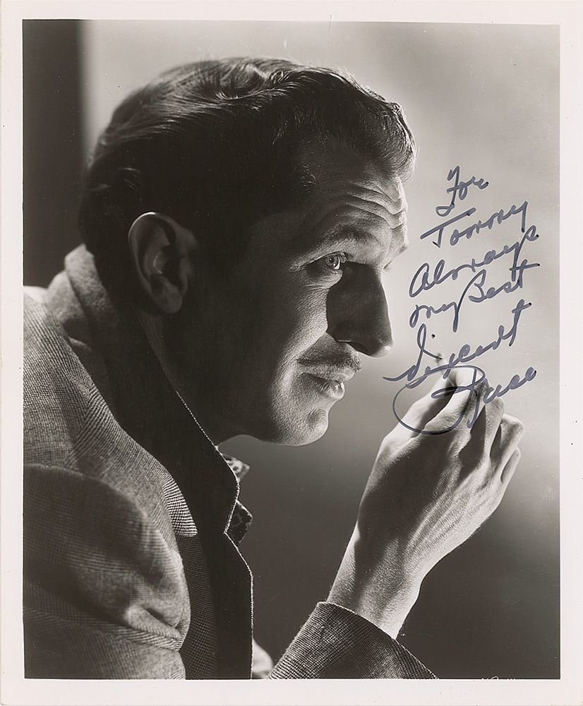 Glossy 8 x 10 photo of Price holding a smoldering cigarette, signed and inscribed in black felt tip “For Tommy, Always my best, Vincent Price.” In fine condition, with a paperclip impression to top edge.