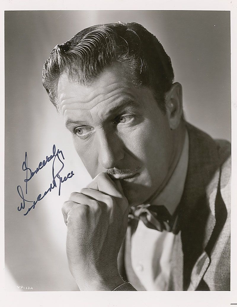 Handsome glossy 8 x 10.25 close-up photo of Price, signed in black felt tip, “Sincerely, Vincent Price.” In very good to fine condition, with a tear to the upper border.