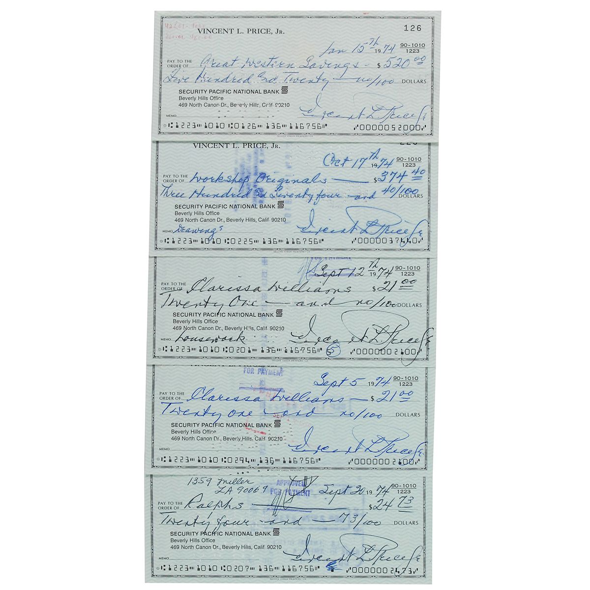 Five personal checks, all 6 x 2.75, all dated from 1974, and all signed “Vincent L. Price, Jr.” In fine condition, with expected stamps and holes, lightly affecting a couple of signatures.