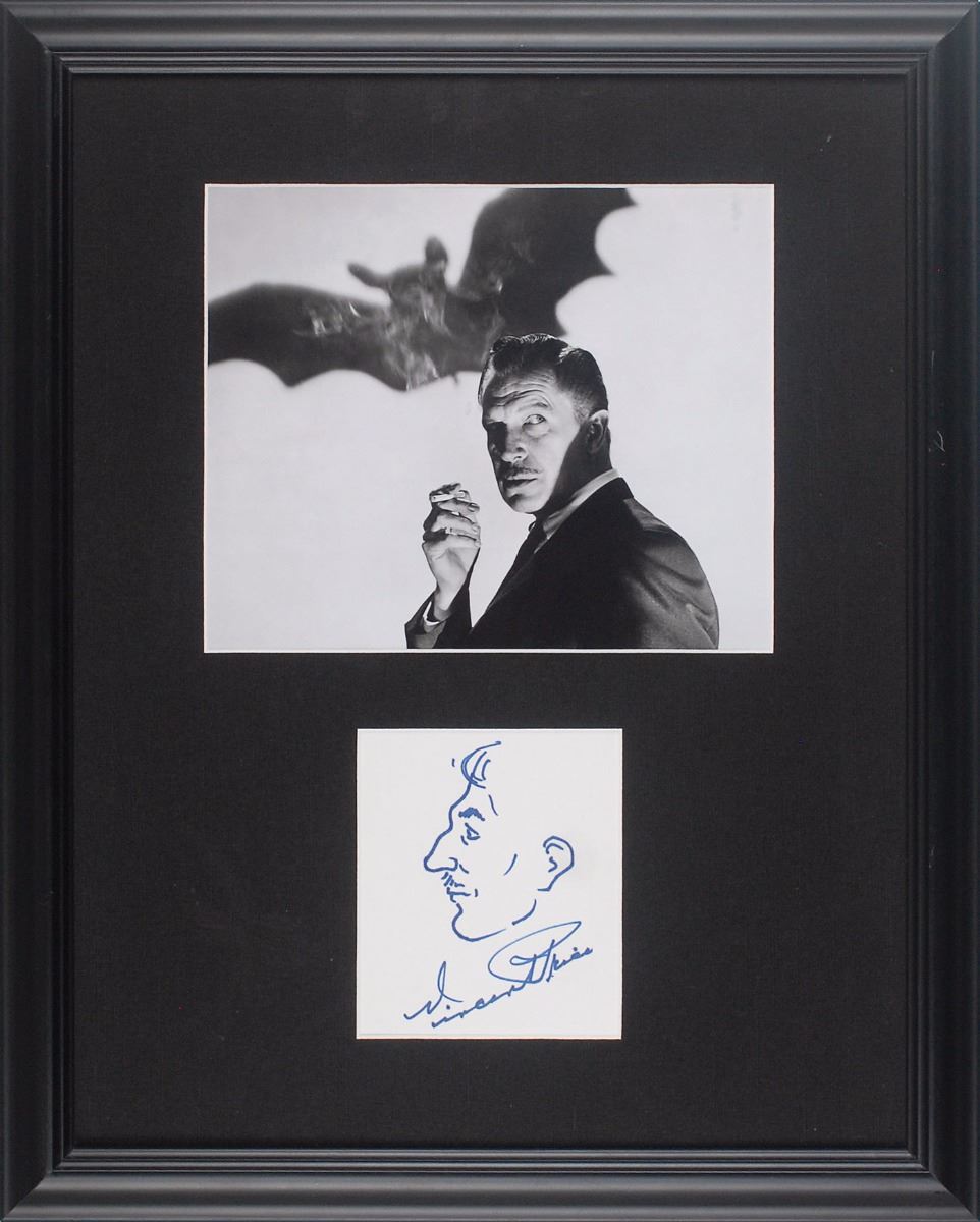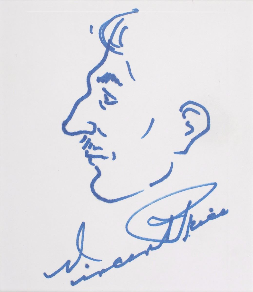 Wonderful blue felt tip self-portrait profile sketch on a white 4.25 x 5 card, signed at the bottom, “Vincent Price.” Cloth-matted and framed with a photo of Price to an overall size of 16.25 x 20.25. In very fine condition.