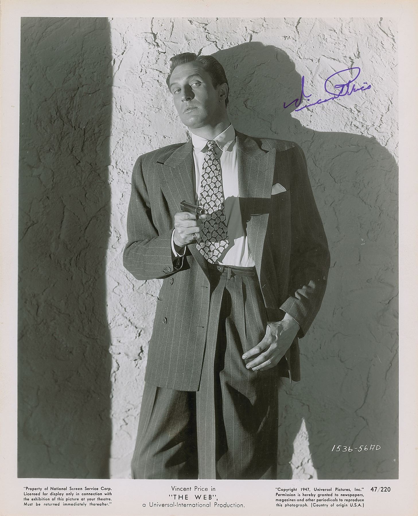 Glossy 8 x 10 photo of Price as Andrew Colby in the 1947 noir crime film The Web, signed in purple felt tip. In fine condition.