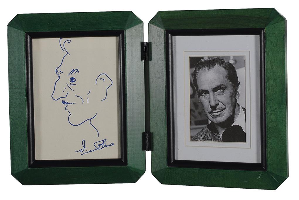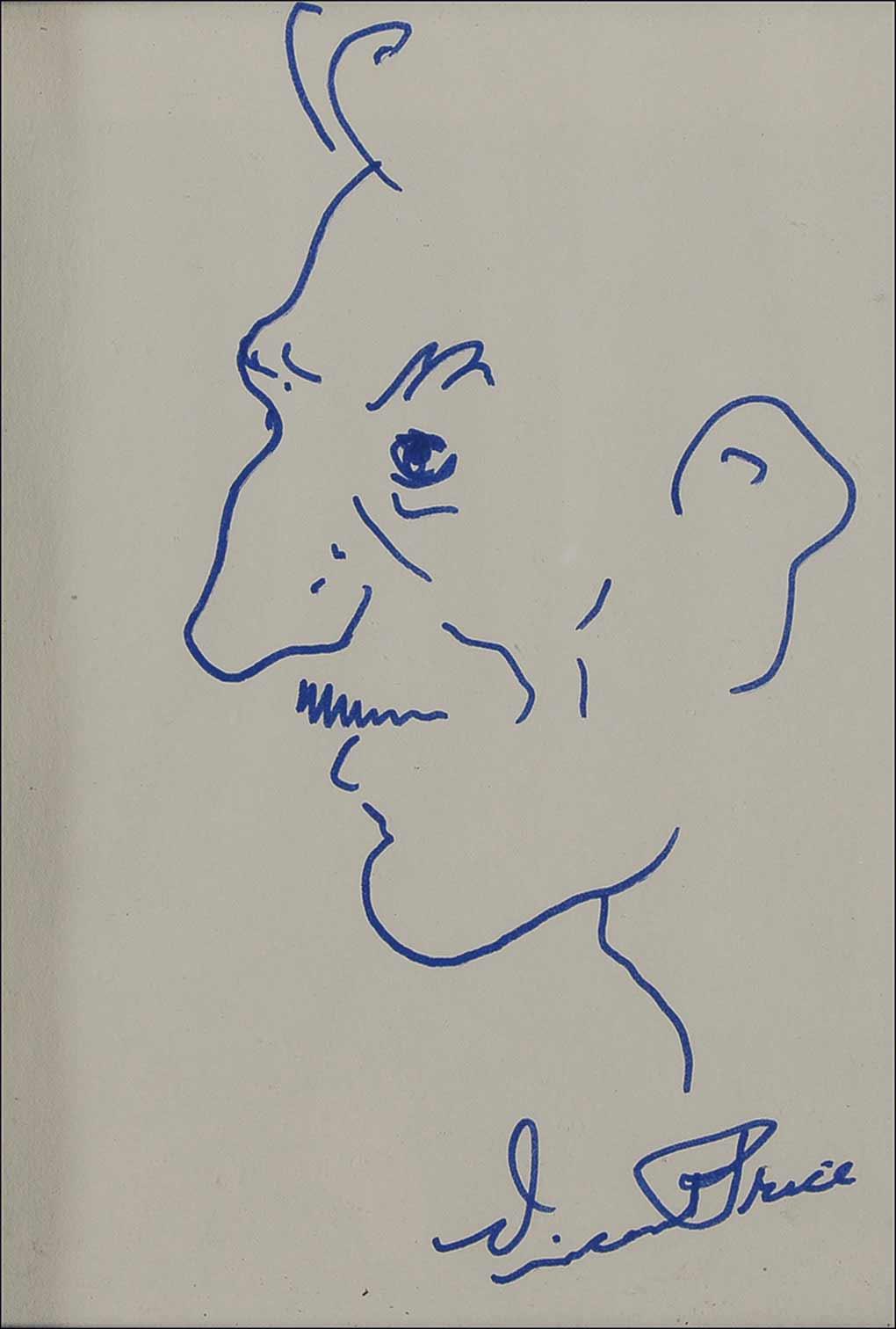 Original signed felt tip self-portrait profile on an off-white 5 x 7 sheet. Framed on one side of a hinged frame, the other side bearing an unsigned photo, to an overall size of 15 x 9.5. In fine condition.