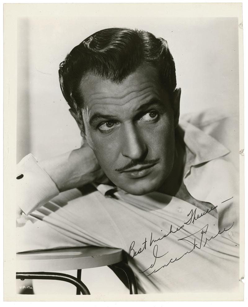Vintage 8 x 10 photo of Price resting his head in his hand, signed and inscribed in black ink “Best wishes Frances—Vincent Price.” In fine condition, with binder dings to right edge, and some scattered light edge creases. Pre-certified PSA/DNA and RRAuction COA.