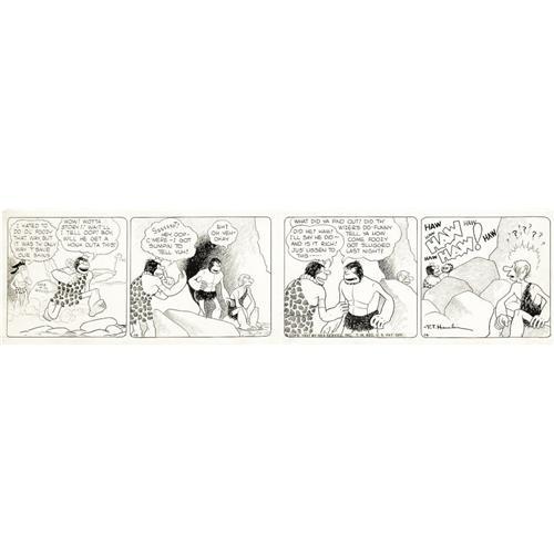 <B>Vincent T. Hamlin - Alley Oop Daily Comic Strip Original Art (NEA Service, 1937).</B></I> When King Guz delivers the story of how Foozy got that knot on his head, everybody laughs -- everybody but Foozy, that is! You're sure to get a "honk" out of this delightful daily by Vincent T. Hamlin! The strip has an image area of 20.5" x 4.5". The art has been folded in half (when sent to the syndicate); otherwise the condition is Excellent. <BR><BR><B>Important notice:</B> Heritage usually auctions material at the rate of 200-250 lots per hour. On some occasions eBay Live bid software or the Internet may not be able to keep up with the pace of the auction. We recommend placing a realistic absentee bid now as insurance to avoid disappointment. Occasionally the auctioneer may eliminate or reject an eBay Live bid, and the auctioneer may also reopen a lot after the close of the eBay live bidding (usually because we missed an audience bid), and may reject your bid even if it shows you as the winning bidder. By bidding via eBay Live, you agree that Heritage may award the lot to another bidder at its sole discretion under the circumstances described above or any other reasonable circumstances. Since eBay bids are not shown to us until we open the lot on the floor, we treat those bids just like floor bids. In most cases the floor responds before the eBay bid is presented to us, due to Internet lag time, so for consistency we have made it a policy that floor bids are always considered first over tie eBay live bids. Also please note that all Heritage lots purchased through eBay Live carry a 22.5% Buyer's Premium. Please make sure you read the Terms and Conditions before you bid. This lot is being auctioned in conjunction with a live floor auction by Heritage Auction Galleries. All final auction and invoice information will be supplied by Heritage Auction Galleries, and all other information should be considered preliminary. Lot:41001 <BR><BR><B>Winning Notification and Billing:</B> After the FINAL session in this auction is complete, Heritage will send e-mail and snail mail invoices. This process normally takes several days. All final auction and invoice information will be supplied by Heritage Auction Galleries, and all other information should be considered preliminary. <BR><BR>This auction will be conducted on a live auction floor and over the Internet through eBay Live. If you choose to place an absentee bid, please take a moment to <font color='#0000ff'><u><a href='http://pages.ebay.com/liveauctions/help/before/laabsentee.html'>learn how eBay Live absentee bidding works</a></u></font><font color='#000000'>