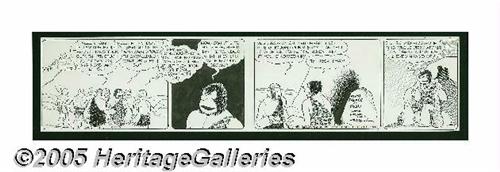 <B>Vincent T. Hamlin - Alley Oop Daily Comic Strip Original Art (NEA, 1937).</B></I> Debuting in 1933, <I>Alley Oop</B></I> was an amazingly popular and well-loved strip. In this quirky installment, King Guzzle gets back his crown, and his seat in the Royal Palace of Moo. Creator V.T. Hamlin had a distinctive cartooning style that has never been surpassed by others. This strip does not have a date designated, but is copyright 1937. The image area measures 20.5" x 5" and the art is in Excellent condition overall, with a crease between the second and third panels.