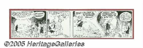 <B>Vincent T. Hamlin - Alley Oop Daily Comic Strip Original Art, dated 2-26-38 (NEA, 1938).</B></I> Queen Umpa has been dethroned -- but the cure may be worse than the disease! Creator V.T. Hamlin was equally adept at the gorgeous and the grotesque, as this stunning strip testifies, and his keen eye for composition and detail was unmatched; this is a near-perfect example of life in the land of Moo. The image area measures 20.5" x 5", and the art is in Excellent condition, with a crease between panels two and three.