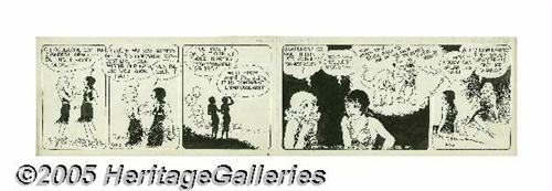 <B>Vincent T. Hamlin - Alley Oop Daily Comic Strip Original Art, dated 9-30-39 (NEA Service, 1939).</B></I> Ooola and her girlfriend have a cavewoman-to-cavewoman chat, in this wonderful <I>Alley Oop</B></I> daily. Goo'ness, this strip is filled with charming images of two Cro-magnon cuties! This art has an image area of 21" x 4.5". It has been folded in half and there are some pencil notations along the edges, outside of the image area. Aside from some slight soiling in the first panel, this strip is in Excellent condition.